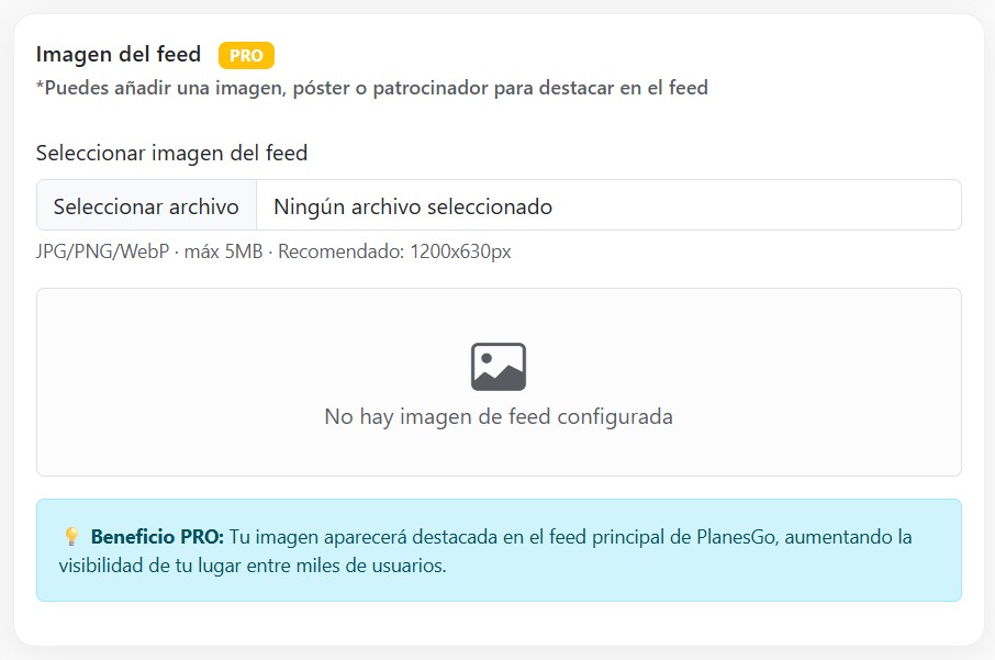 Siendo usuario PRO/PREMIUM puedes adjuntar desde tu panel de control una imagen de feed en la ficha del negocio/lugar, puedes actualizarla tantas veces como desees y está pensada para mostrar patrocinadores, ofertas, promociones, descuentos, etc... del lugar.
